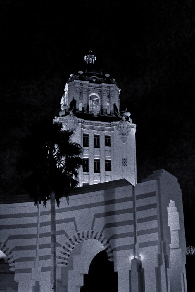 On the way back from somewhere the other night Mitzi suggested I might want to take a look at the Beverly Hills City Hall complex – that it might have some photographic value to impart. I had shot this from a couple of distant angles during the day but hadn’t seen it at night. I’m glad she brought this up. It’s a beautiful spot and indeed has a great deal of photographic appeal.